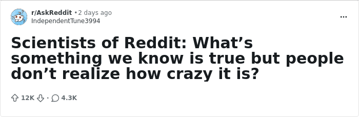 If that didn’t blow your mind, this list has a lot more where that came from. These are responses from a recent Reddit thread, bearing a question originally directed at scientists: “What’s something we know is true but people don’t realize how crazy it is?”