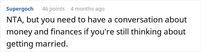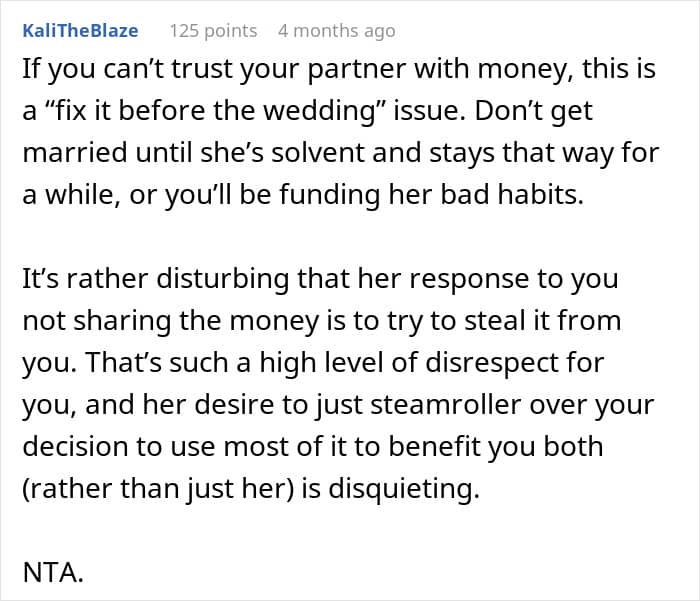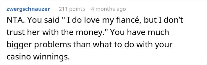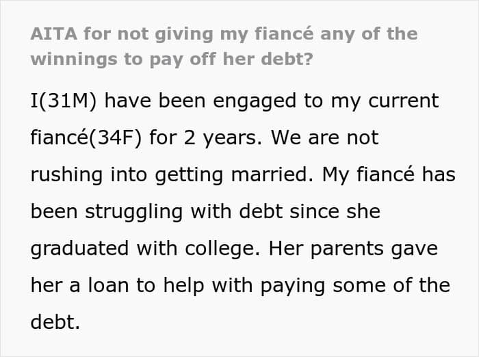 For this 31-year-old guy, this became a reality after “winning a large jackpot.” The thing is since he’s now engaged, his 34-year-old fiancée who “is not good with money,” in the OP’s words, expects his money will be hers.
