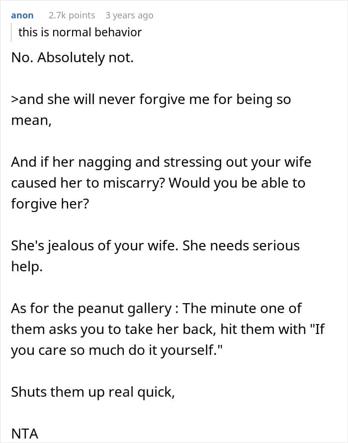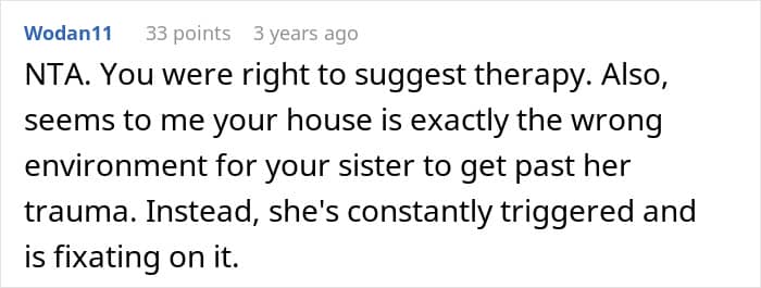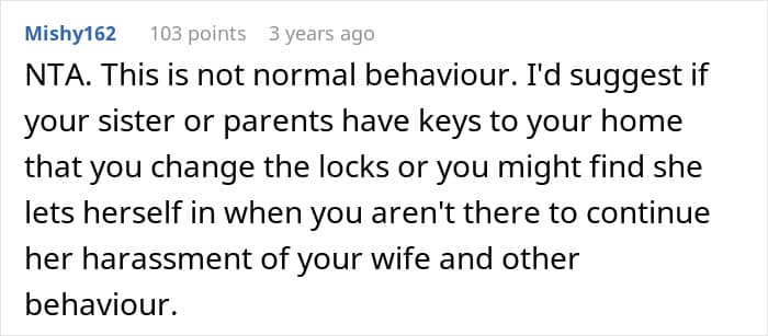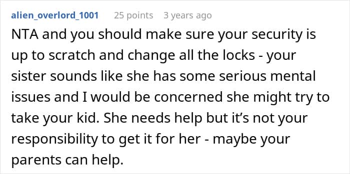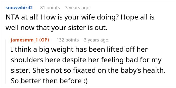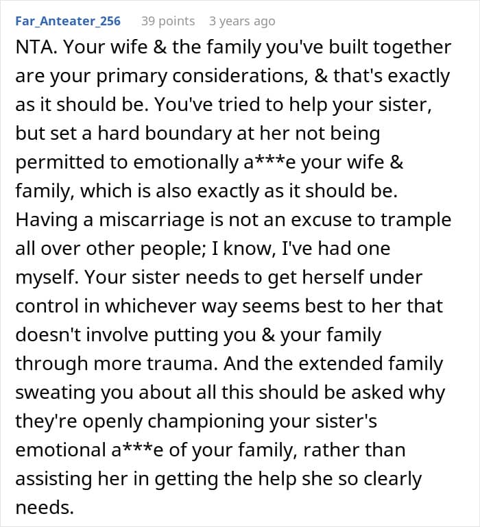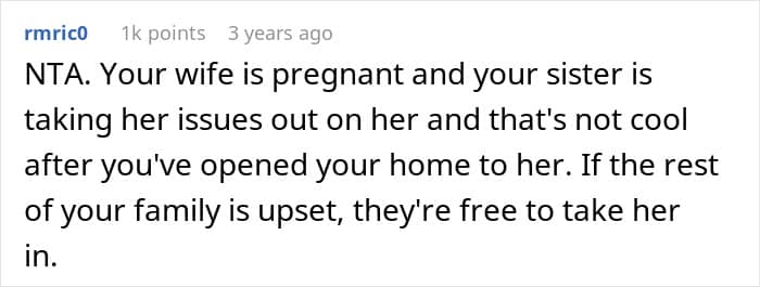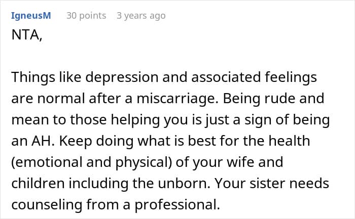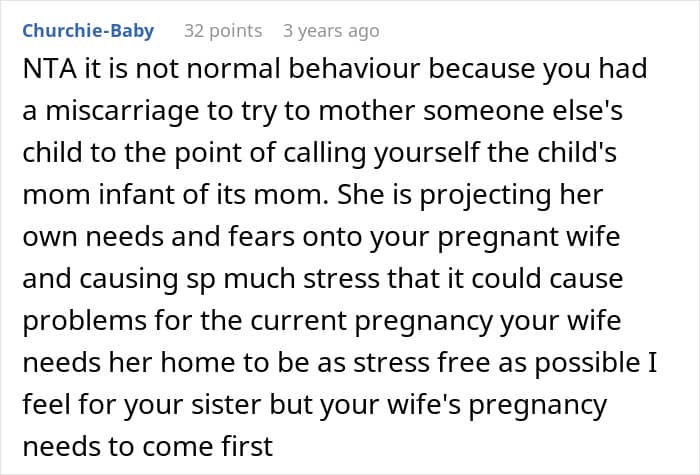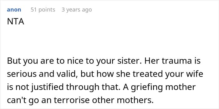 In this story, the sister clearly wasn’t coping in a healthy way. Her grief started spilling into her pregnant sister-in-law’s life, adding stress to a woman who already had enough on her plate. As heartbreaking as it was, her brother had to step in and protect his wife and child, even if it meant making a difficult decision about his sister.