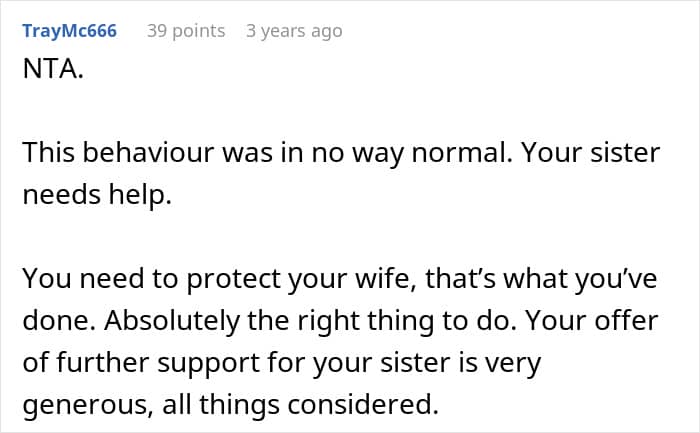 Readers agreed he did the right thing to protect his pregnant wife, but many also said his sister likely needs professional mental health support
