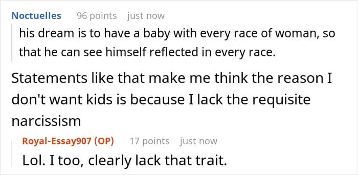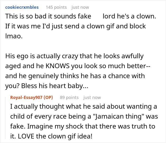 That alone might have been enough, but he went way further. He actually claimed that “like all Jamaican men”, his dream was to have a baby with every race of woman so he could see himself reflected in each one. OP later asked three Jamaican men she knew about it; two admitted it had once been a childish fantasy, and one just scoffed at the idea.