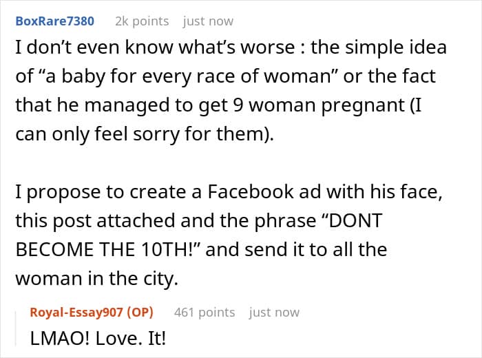 In the comments, readers expressed their disbelief at the ex’s bizarre ideas about serial-impregnation and said he deserved nothing more than the clown emoji