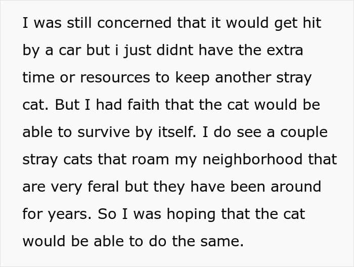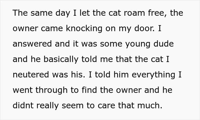 Unfortunately, as soon as the poster let the feline loose, its owner came rushing to confront him. The other man got mad that his cat had been neutered because he had wanted to breed it. That’s when the OP pointed out that the man hadn’t even put any identification on his pet, and didn’t seem to be bothered that it had been gone for days.