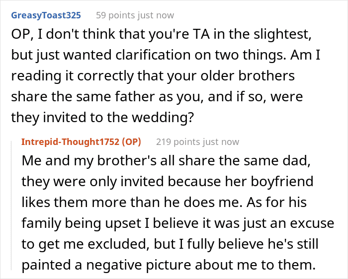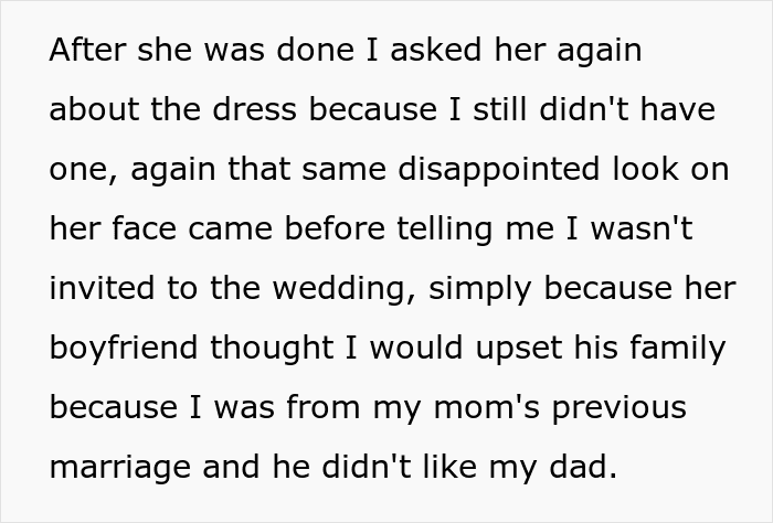 Many believed that refusing to invite your partner’s child to your wedding and causing tension in the mother-daughter bond is enough to sound the alarm on this relationship. But the unfortunate reality is that thrusting into a new domestic situation can be daunting and challenging for every member of the family (although that does not give the right to make a child feel unwelcome in the family). Thankfully, the author of this story has a support network to help her navigate through this unfortunate situation and can count on her brothers and dad to have her back.