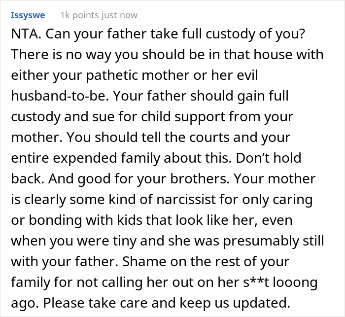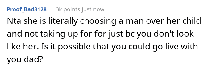 After reading the story, the vast majority of Redditors expressed overwhelming support for the teen and raised serious concerns about her mother’s behavior. The user later clarified a few details in the comments, saying that she usually spends time with her mom when her boyfriend is not around, claiming that this way, “she wants to keep the peace”.