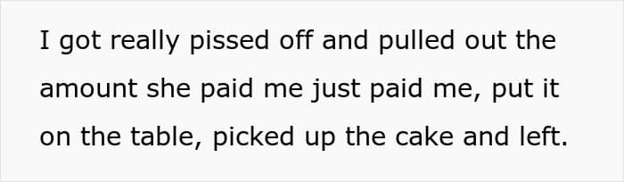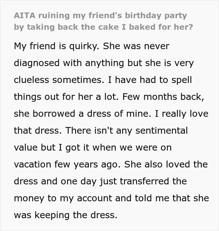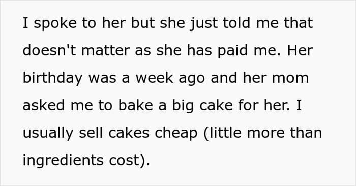 Instead, the mother also insisted that she didn’t see the issue because her daughter had paid for the dress. Feeling unheard and frustrated, the OP placed the money of the cake back on the table, picked up the cake, and walked out. The mother got angry and started yelling, accusing the OP of ruining the birthday party especially since the friend was left without a cake.
