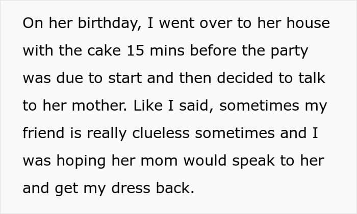 Now, the friend’s birthday was approaching and her mother asked the OP to help bake a cake for the friend. The OP agreed, resolving to also use the opportunity to raise the issue of the dress to the mom for backup. When she arrived with the cake and the party starting in 15 minutes, she gently raised the issue up.