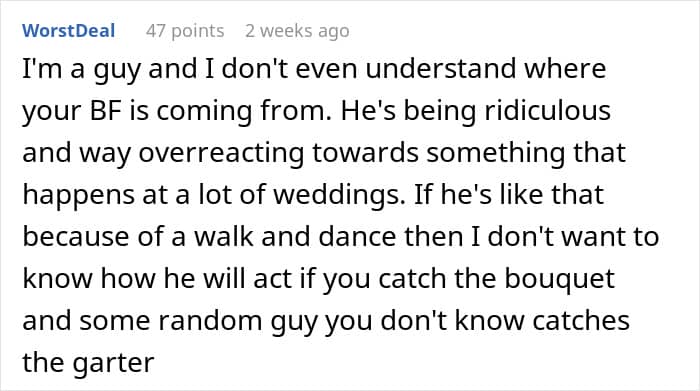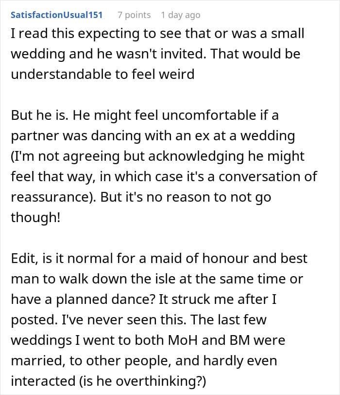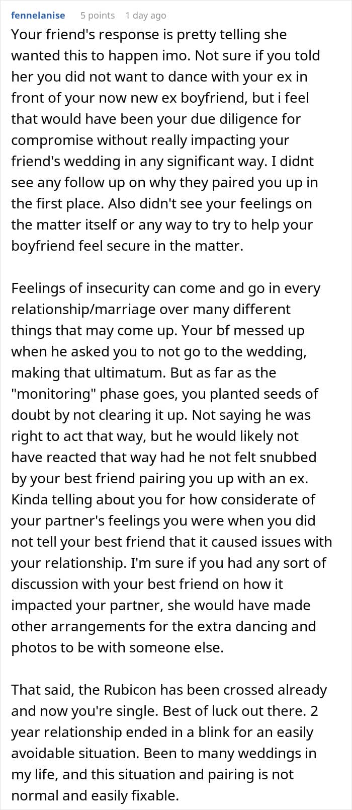 Instead of sharing in her excitement, her BF has asked her not to go to the “romantic event.” His issue lies with the fact that an ex of hers is the best man and he isn’t cool with them being paired up for the wedding. The woman says she really wants to be there for her friend but she understands where her boyfriend is coming from.