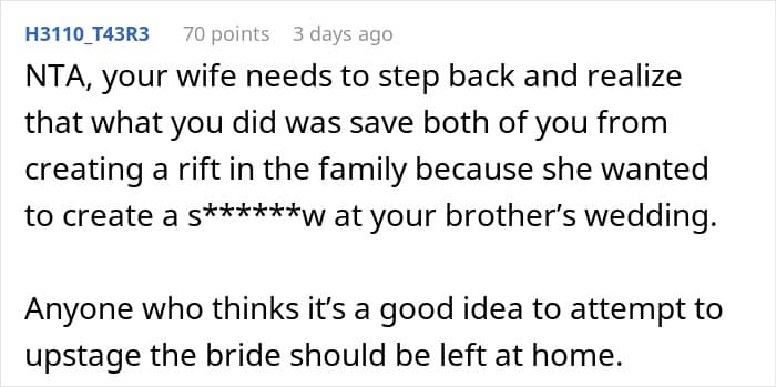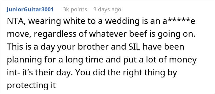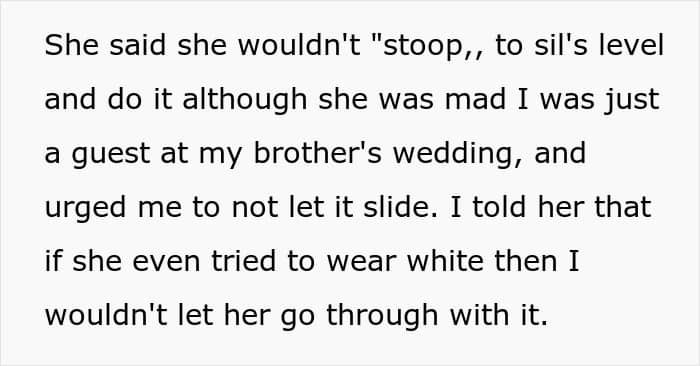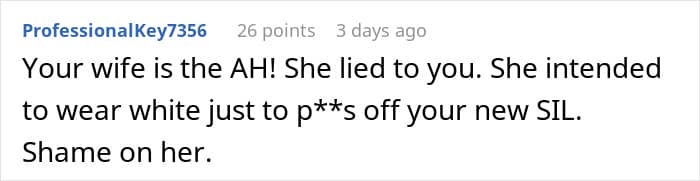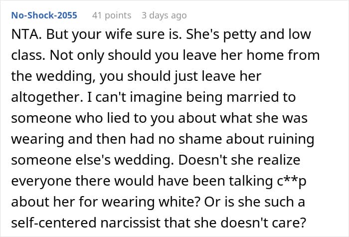 The man’s wife seemingly felt entitled to steal the bride’s thunder by wearing a white dress to the wedding. She likely knows it will cause a stir, yet she makes excuses to force the issue.
