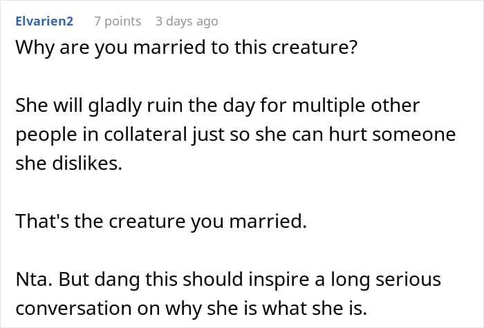 In the story’s case, the husband’s decision to leave his wife behind was his way of putting his foot down and refusing to accept her behavior. The woman was out of control and could potentially ruin someone else’s big day – all because she was acting out of spite.