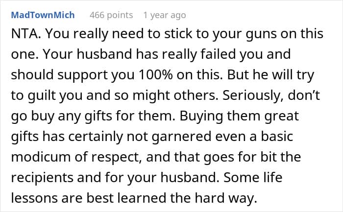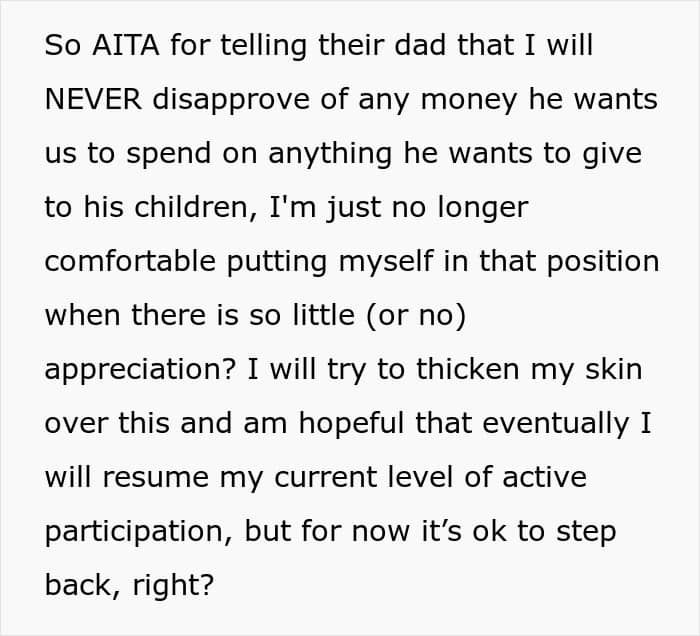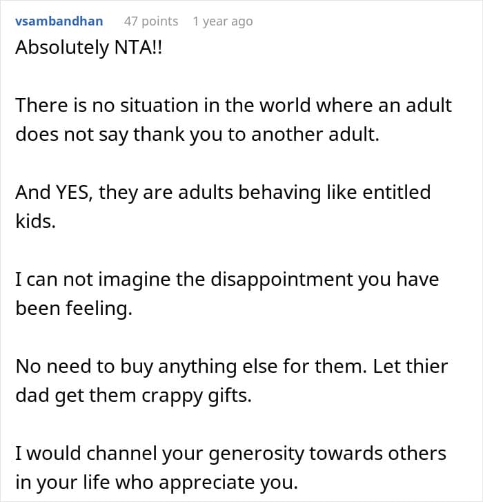 If anything, cutting back on gift-giving and focusing on shared moments might be more meaningful. “I’d advise the woman to reconsider her approach in creating closeness, because some people do not value gifts as much as others, and her stepchildren may prefer alternative ways to connect, such as spending time together or checking in more often,” Morgan said.