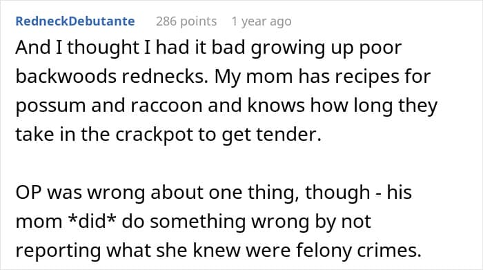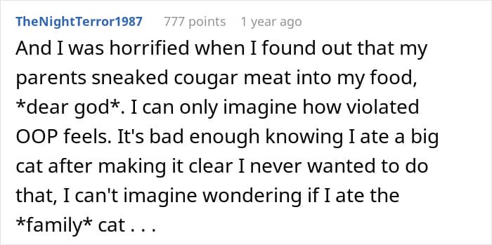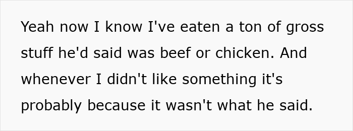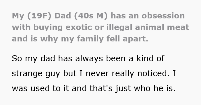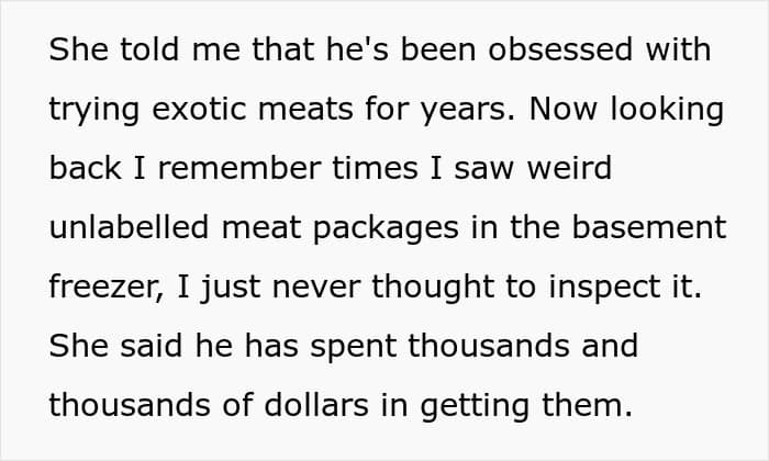 Apparently, her dad has an extreme obsession with exotic and illegal animal meat. And so, when he secretly slipped some kangaroo meat into relatives’ meals, they didn’t want to visit anymore. Turns out, it wasn’t the only time he did that – throughout the years, he fed his family various kinds of meats, lying, saying it was beef, chicken, and so on.
