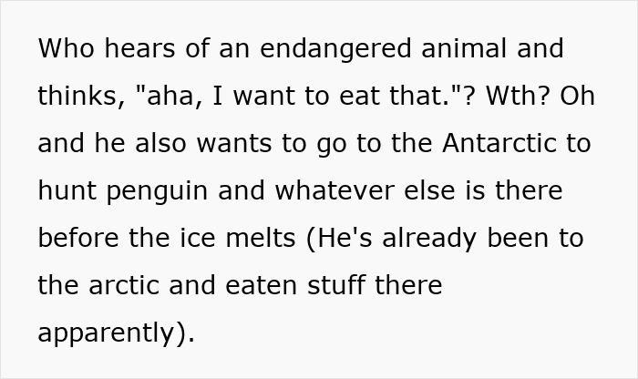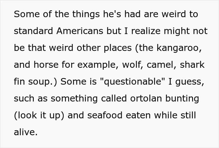 Basically, this man is obsessed with trying out various exotic meats and does not shy away from putting a financial strain or dabbling in criminal behavior to obtain them. He has sought out kangaroos, horses, wolves, camels, sharks, ortolan bunting’s meat, and seafood that’s being eaten while still alive, and so many others, including bald eagle, which is straight up illegal.