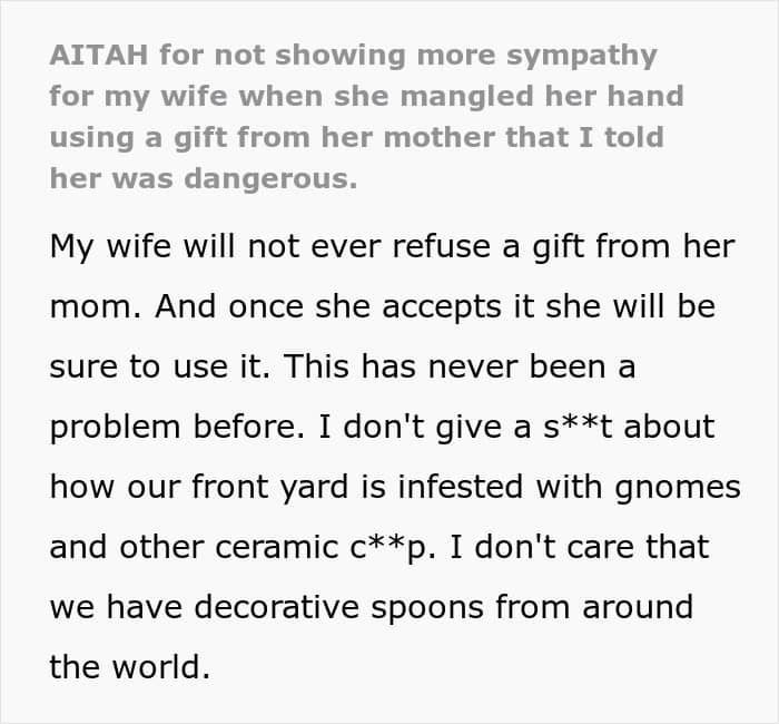 Unless, of course, the present is a hazard. One man reached out to Reddit for advice after his wife ended up in the hospital thanks to a gift her mother gave her. Below, you’ll find the full story detailing how the husband somehow ended up in the doghouse, as well as some of the replies invested readers left him.