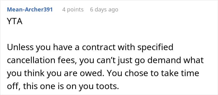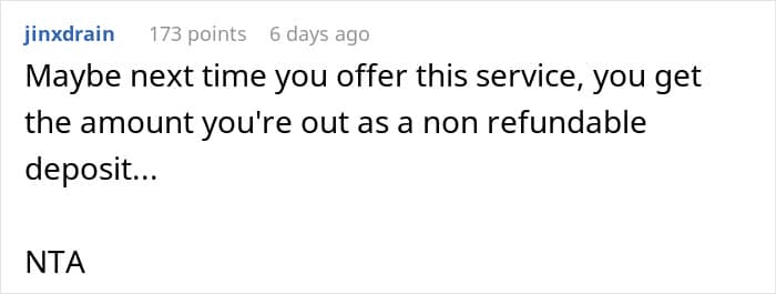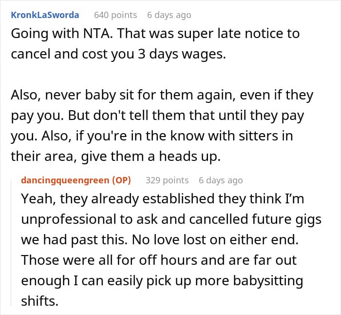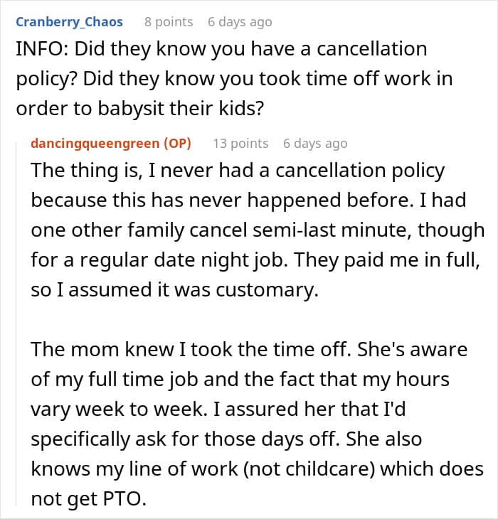 The babysitter felt that she deserved to be paid at least what she would have made at her other job during that period, but the couple thought she was being ridiculous.