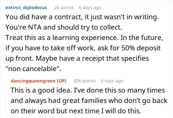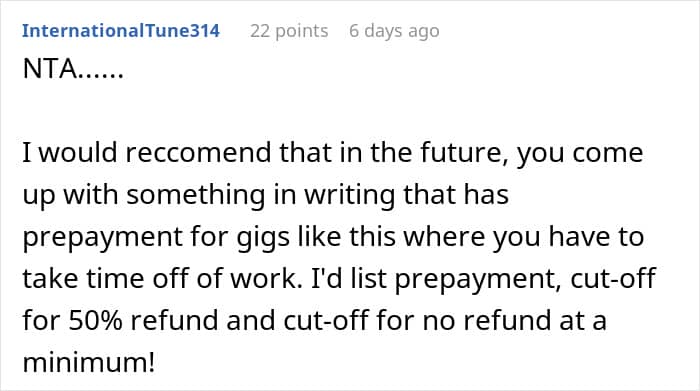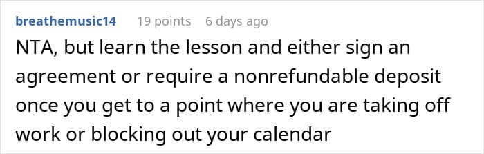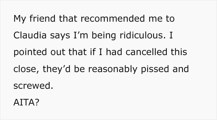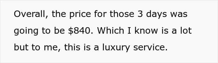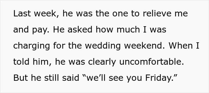 Preparing for the gig, the Redditor even took time off her regular work. However, she later received an unexpected text from the couple, saying that her services are no longer needed.