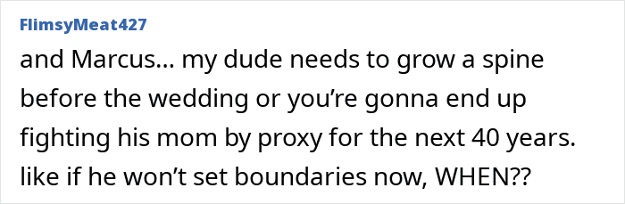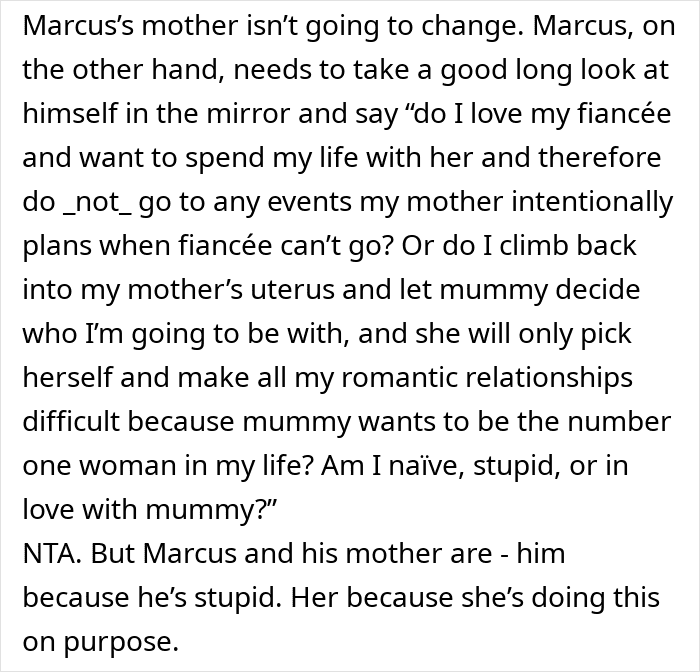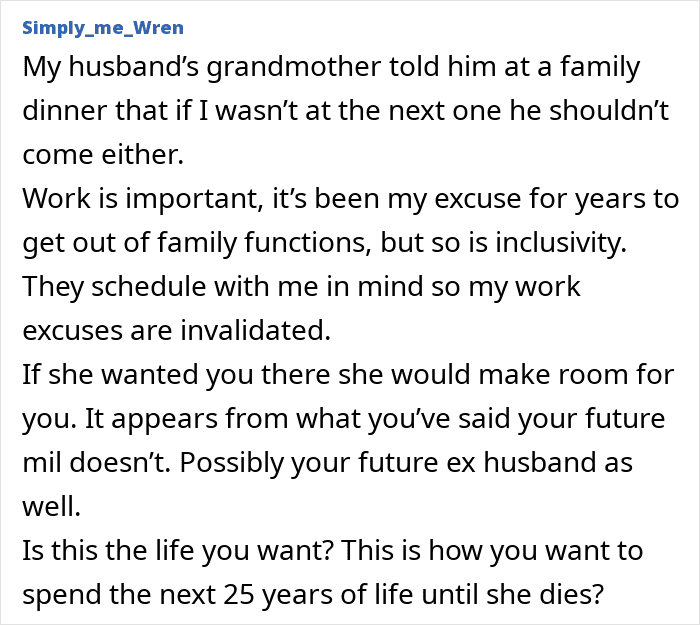 So she finally decided that if her fiancé’s mom doesn’t want her there, she’ll stop trying to attend at all