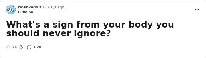 But our bodies have a way of telling us something is wrong, we just have to listen. To make people more aware of the red flags our bodies sometimes wave at us, one netizen recently asked: “What’s a sign from your body you should never ignore?” From how to recognize dangerous moles to learning to trust your gut, folks had all kinds of answers.
