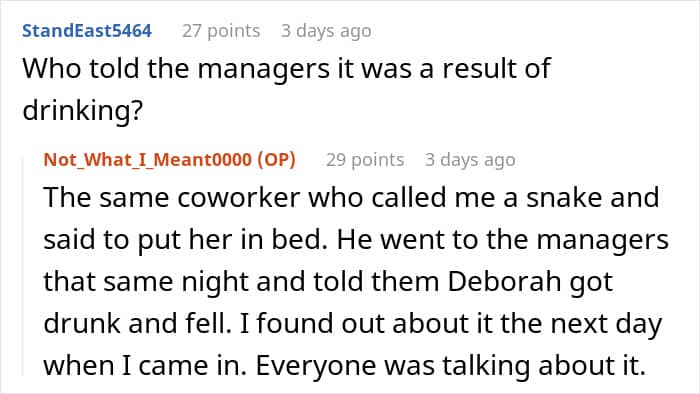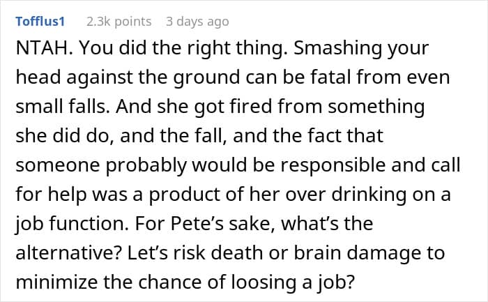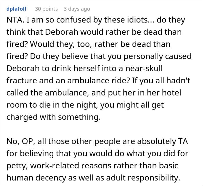 Last week, a young employee shared her story on r/AITAH about an incident during a business trip when she stepped in to help an intoxicated colleague, only to face backlash for her actions.