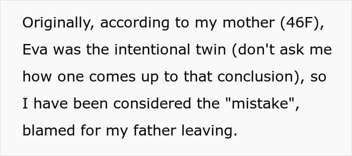 The poster’s dad abandoned them as she was born as a twin, so her mom and siblings always blamed her for it, and neglected her