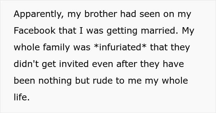When her brother found out that she was getting married, she agreed to invite them, but her mom and sister got into a fight with the groom and caused a scene