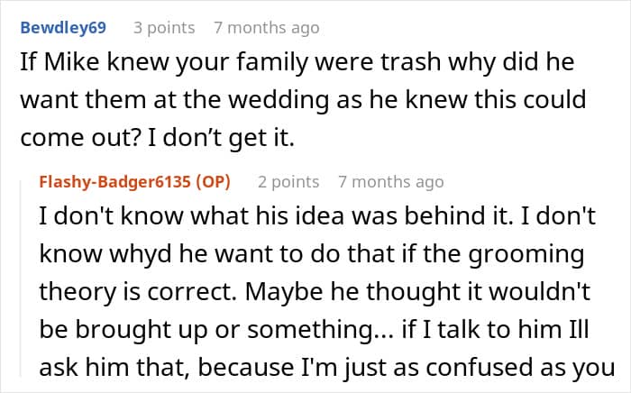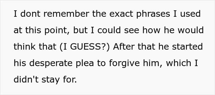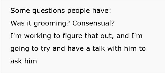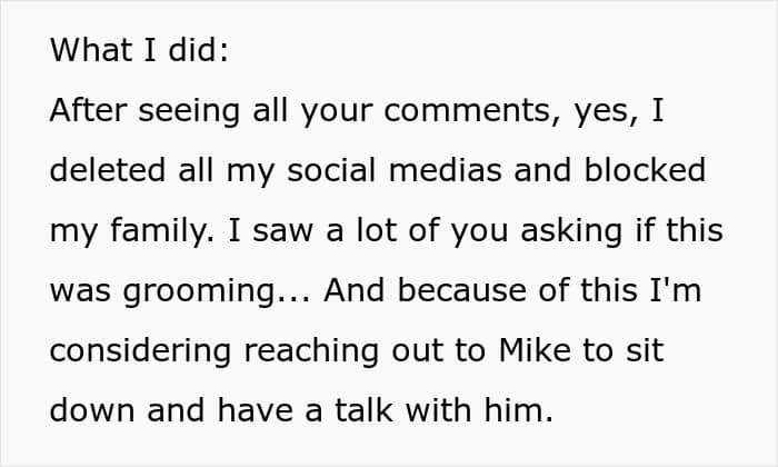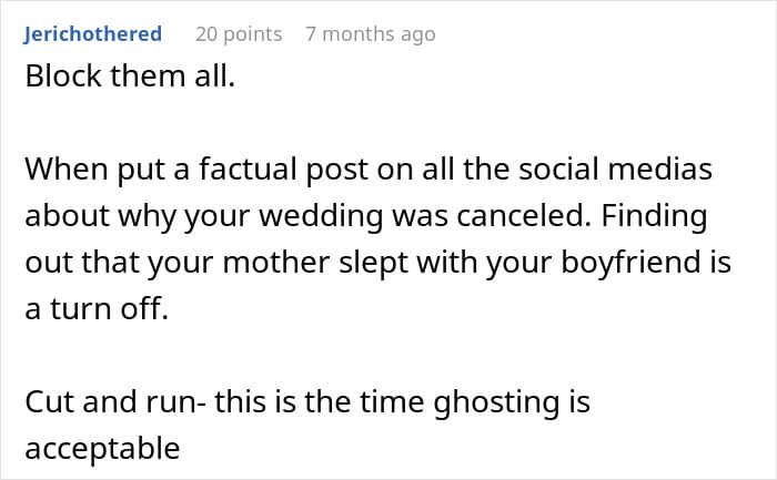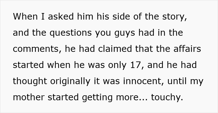 After a lot of netizens claimed that her mom might have groomed her boyfriend as a teen, she agreed to meet him, and he was a mess. He explained how it started when he was just 17, but then her mom started getting “touchy” with him. OP couldn’t believe how, despite all this, he had agreed to invite them to the wedding, and refused to forgive him for everything, even when he begged her.
