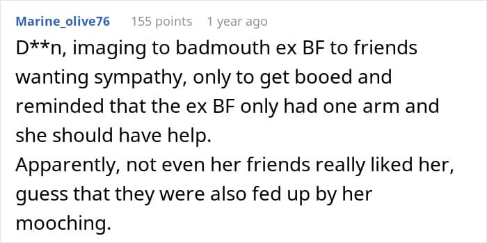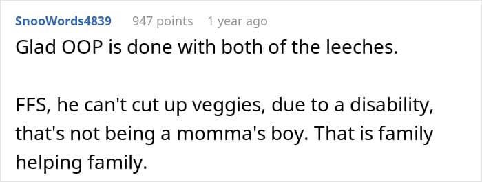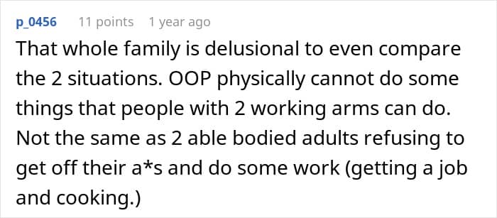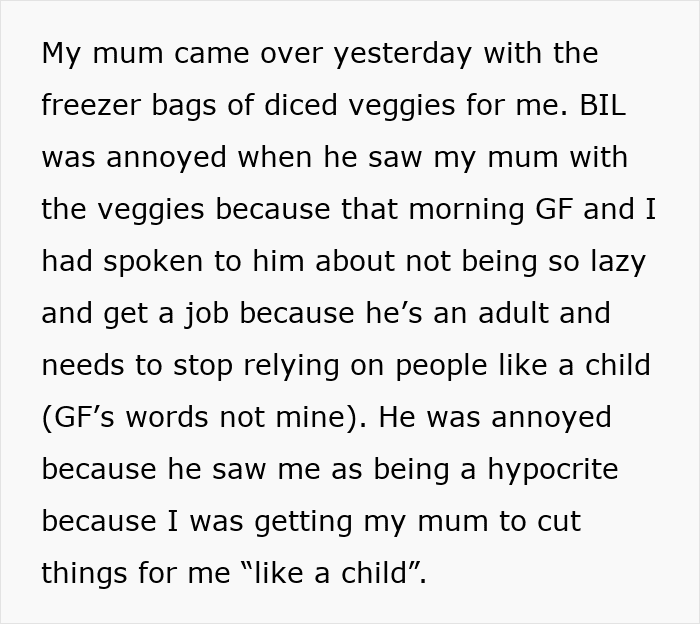 This guy was born with a condition that left him without one arm. Still, he would do most things on his own, except he needed some help with chopping his own veggies. When his girlfriend’s freeloader brother came to stay with them, he called the disabled man out for being “lazy” and a “mummy’s boy.” But when other people weighed in on the story, it became clear who the real jerks in this story were.