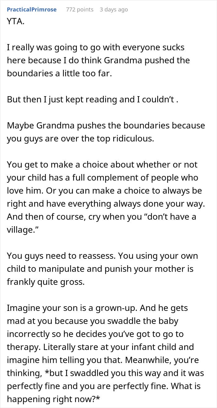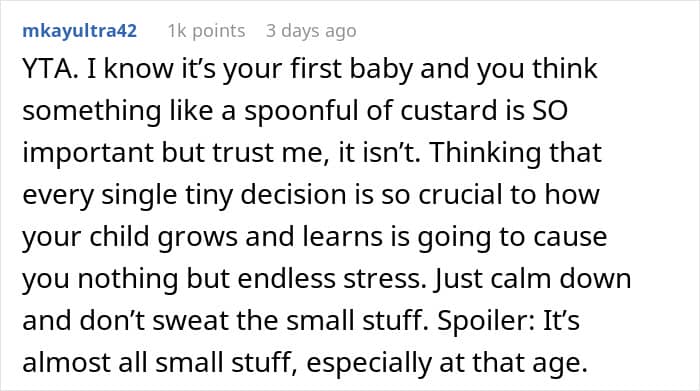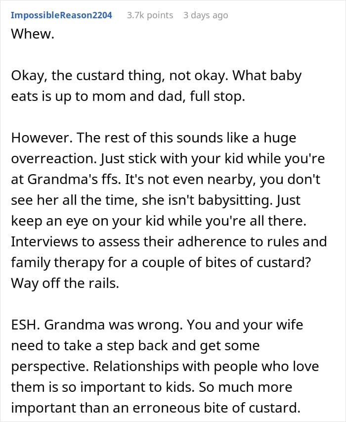 But the drama that ensued after this grandma fed a baby custard is one for the books. The parents got so mad at her saying “Rules don’t apply to grandma” that now they’re threatening to ban visits altogether. The story had people arguing over what’s a boundary and what’s just a personal preference when it comes to parenting.