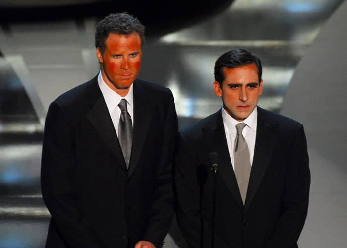 Actors Steve Carell and Will Ferrell walked onto the stage to present the Oscar for Best Makeup, but both appeared in exaggerated, intentionally terrible cosmetic looks.