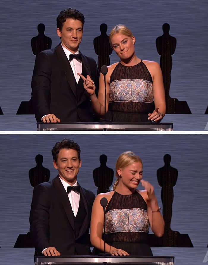 While presenting with actor Miles Teller during the 2015 Scientific and Technical Awards ceremony, Robbie suddenly began struggling to read her lines.