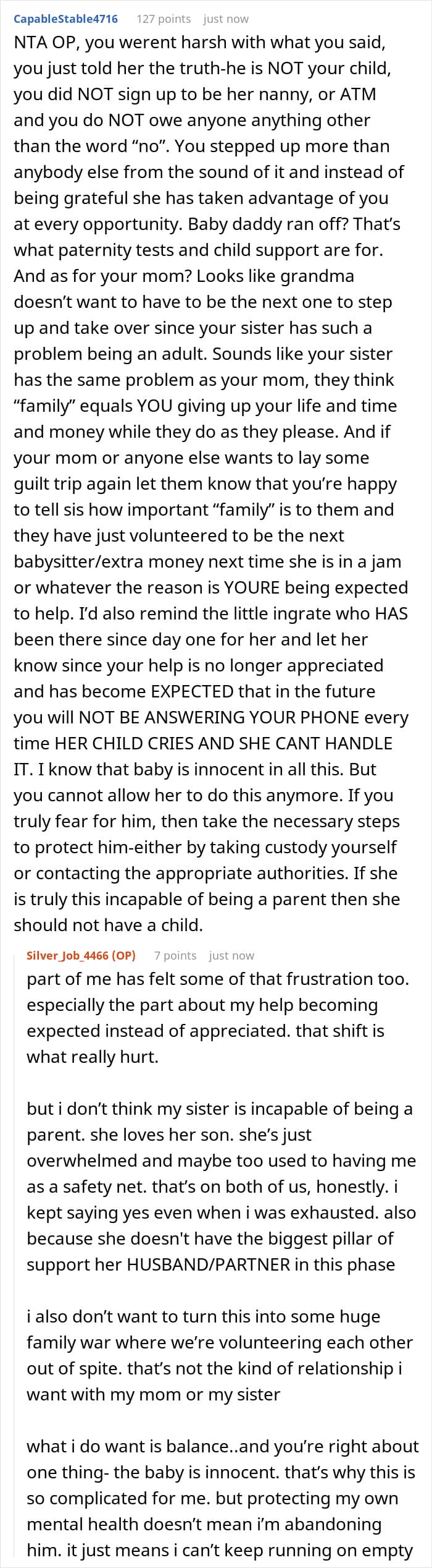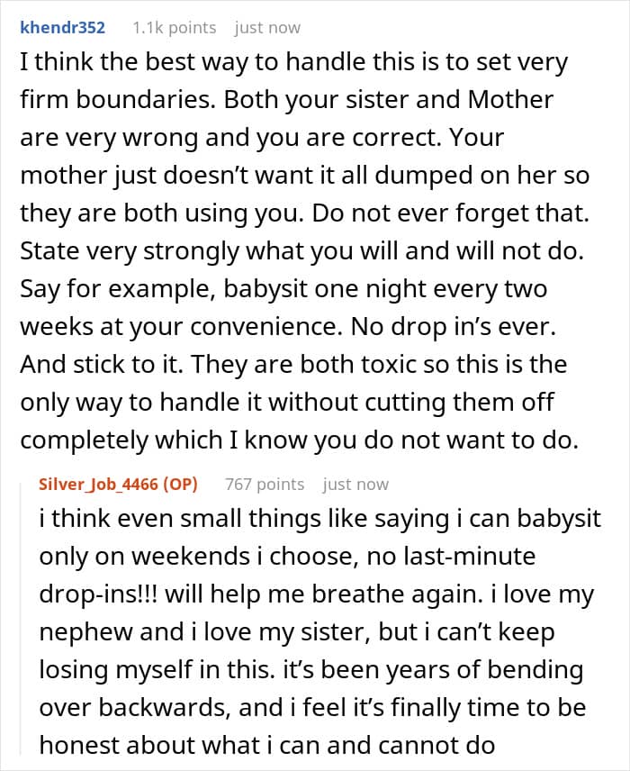 The author of our story today, the user u/Silver_Job_4466, once allowed her pity and love for her younger sis and newborn nephew to override rationality. And then, over time, it turned out that refusing to sacrifice her personal life for the sake of free babysitting began to feel like a betrayal. Okay, let’s just cut to the chase now.