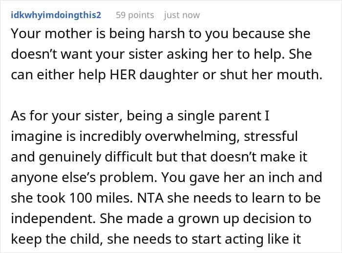 People in the comments also unanimously supported the author, assuring her that she did absolutely the right thing by asserting her own boundaries and trying to find a balance between helping family members and her personal life. “You gave her an inch and she took 100 miles,” one of the responders wrote wisely. So do you, our dear readers, also agree with this?