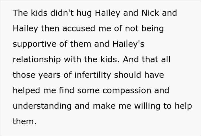 In fact, the couple also tried to force them to spend mother’s days with her, but to no avail. However, things just got nasty after they told the poster that Hailey is infertile, so they can’t have their own children. Somehow, they just expected OP to feel pity for them, take a back seat, and let them take the kids to Hailey’s hometown in Canada for a month.