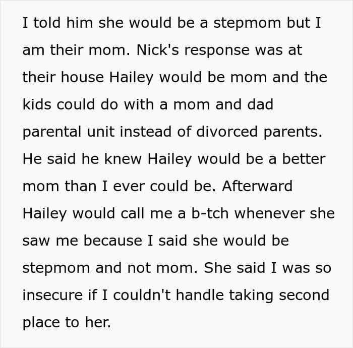 The poster had been co-parenting her 3 kids with her ex (Nick), when he suddenly introduced a new woman (Hailey) and forced them to bond with her