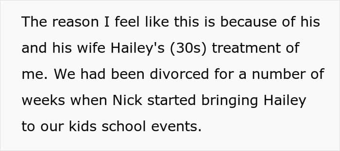 Nick also damaged things further by trying to make OP assign tasks to Hailey, like dropping off and picking up their children. Now, she was a complete stranger to them, and no parent would trust their kids with just anyone. Of course, the poster objected, but then, her ex took her to court. It’s hardly a surprise that the judge ruled in OP’s favor, as Nick was trying to alienate her.