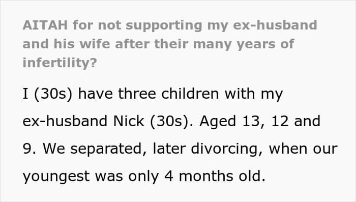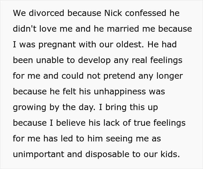 Today, we dive into the life of the original poster (OP), who is the mom of 3 kids. She divorced her husband (Nick) after he confessed that he didn’t love her and only married her when she was pregnant with their oldest. As if this was not enough, he started seeing her as an unimportant person for their kids, and brought along a new person (Hailey) into their lives.