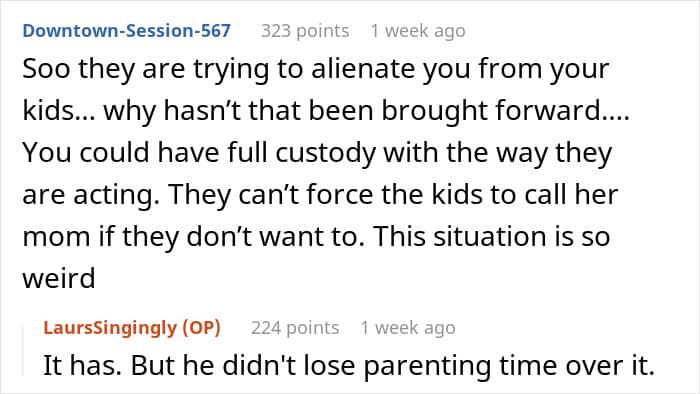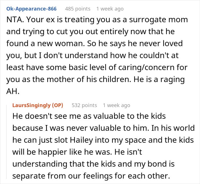 The shocking part is that he wanted to erase the poster from their children’s lives and let Hailey be their “new mom”. Obviously, OP got angry, and she didn’t want to let it happen when she was still very much present in their lives. Experts warn that when one parent uses this alienation behavior, it can strain relationships for everyone involved, especially the kids.