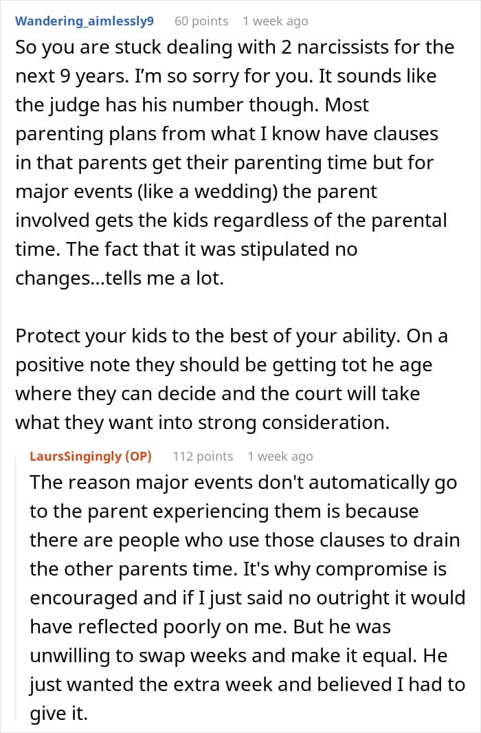 Even Redditors felt that their actions were too entitled and that all their drama would also hurt the children. Many suggested that OP didn’t need to coordinate her parenting time just for their whims and fancies. Do you agree with them? Let us know in the comments!