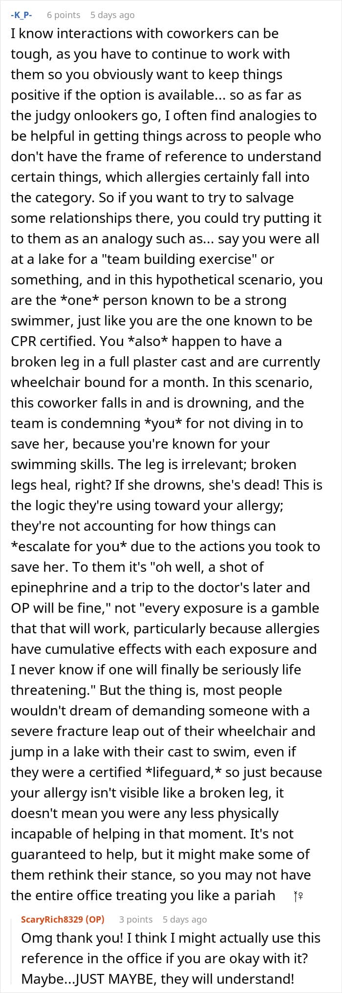 The coworkers’ suggestion that he “could have helped” ignores a fundamental rule of first aid. As theNHSand other first aid organizations make clear, the absolute first step in any emergency is to ensure yourownsafety. You cannot help someone else if you become a casualty yourself. By approaching a situation that could have triggered his own anaphylactic shock, he could have triggered a second medical emergency.