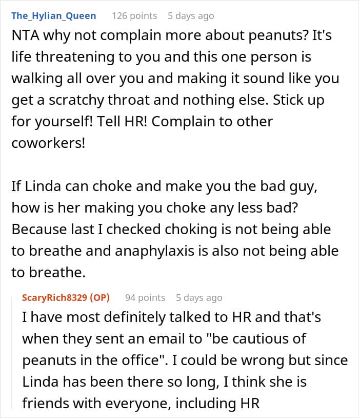 A man with a life-threatening, full-blown anaphylactic peanut allergy has spent his entire time at his current job in a state of high alert. He carries two EpiPens, he’s made sure everyone knows about his condition, and he’s even been hospitalized after a cross-contamination incident at the office. Yet one coworker, Linda (why is it always a Linda?), has always treated his insane allergy like he’s just being “dramatic.”