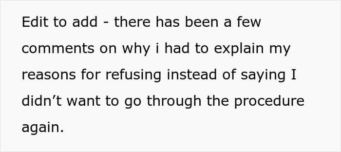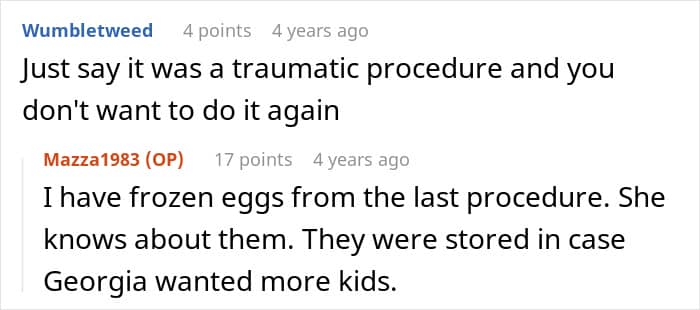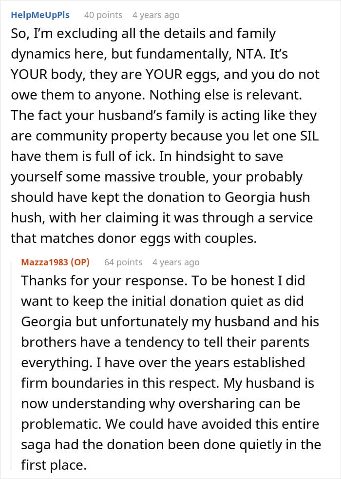Netizens sided with the OP, emphasizing that egg donation is her personal choice and that she isn’t obligated to agree a second time. They also acknowledged her other concerns, like financial instability and a volatile relationship, as legitimate reasons for refusing. Do you think saying no to a second donation makes someone selfish, or is it reasonable? We would love to know your thoughts!