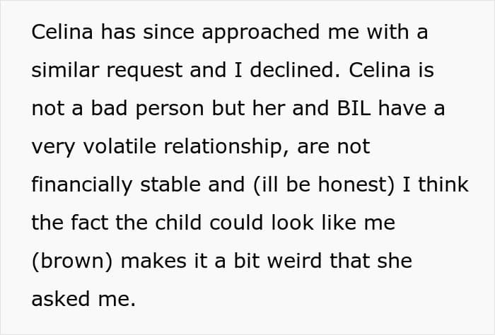Recently, the other sister-in-law requested the same, but the author declined, pointing out her unstable marriage and personal discomfort with the child potentially resembling her