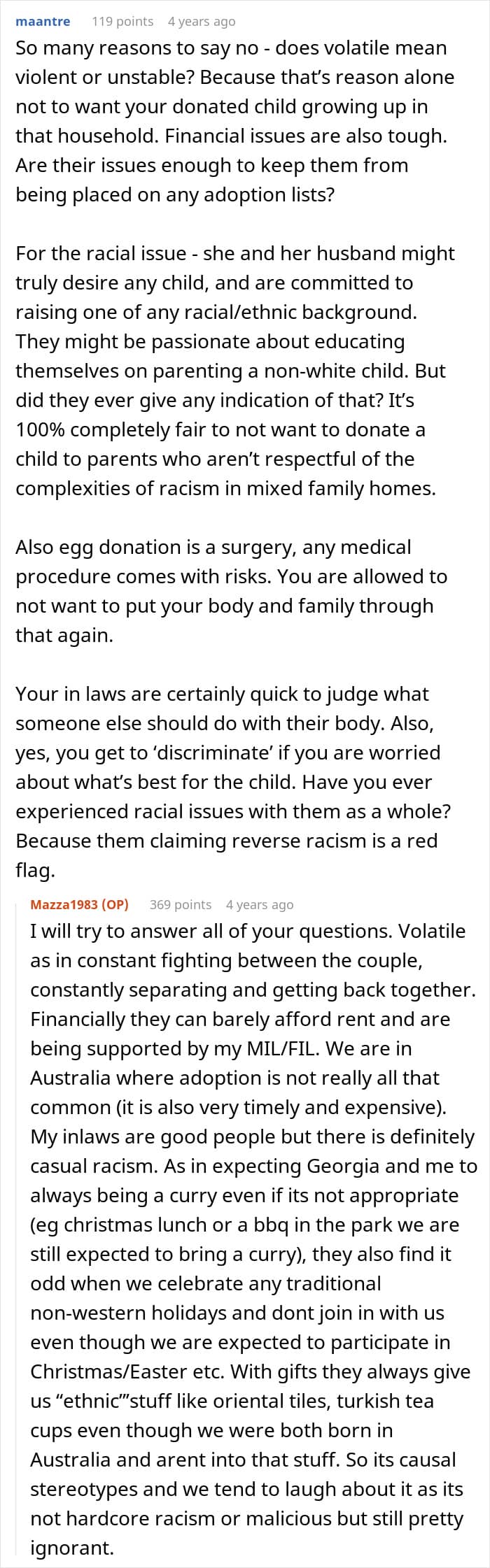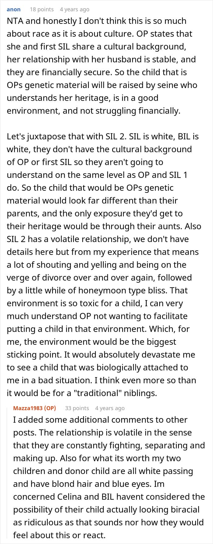 Another thing for her was the fact that the sister-in-law and her husband were white. The OP admitted feeling uncomfortable with the possibility that a child born into that household could resemble her in ways that might complicate identity or family dynamics.