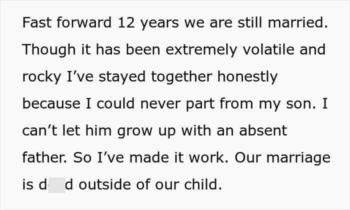 This marriage was unhappy from the start, at least according to the author. He mentions how their relationship was “extremely volatile and rocky” from the start, and how he only stayed because of his son. Some commenters questioned his decision, saying, “Don’t stay in a toxic marriage because you have a child.”