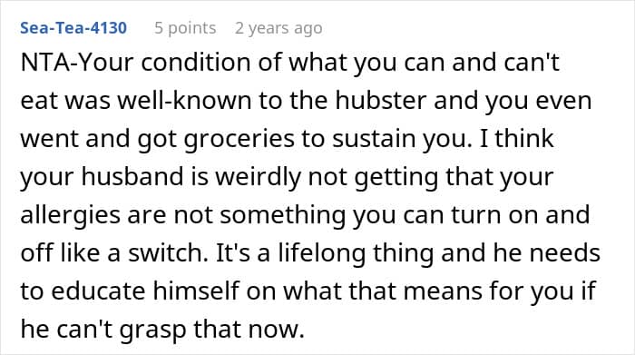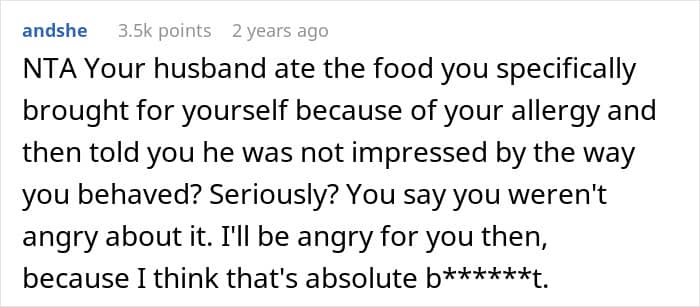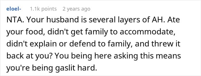 Readers assured the woman that she had done nothing wrong, and many called out her husband for eating her safe food before she could