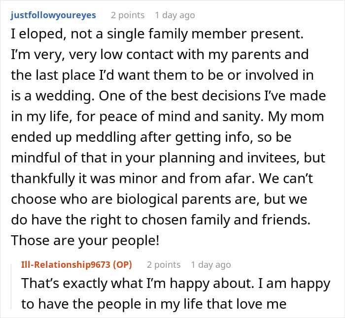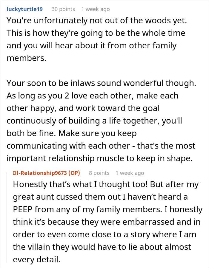 That was the last straw for the bridal couple, as OP cut them off from her life. However, the juicy part was how she got her revenge because of her savage great aunt. The old lady didn’t even hesitate to harshly call out their behavior. As a cherry on top, the poster also gained wonderful in-laws, who stood by her during all this and treated her like their own daughter.