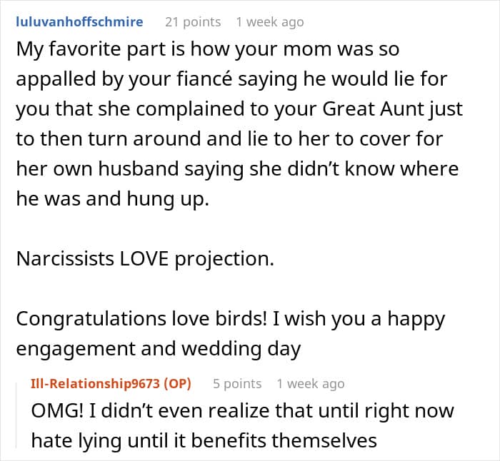 Moreover, they also skipped out on their engagement party, all because OP couldn’t attend her mother’s extravagant birthday, as she couldn’t afford it. As if shamelessly declining her in-laws’ invitation to this party wasn’t enough, the cruel parents had more drama up their sleeves. Since her dad was whining about the whole “blessing” thing, her fiancé planned to do it.