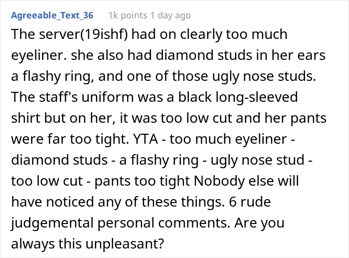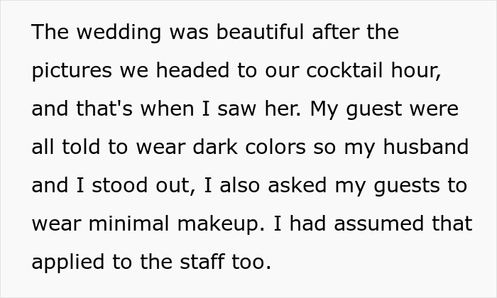 Everyone obeyed the request but one of the servers, as it seemed to her, looked “too flashy”. The girl, about 19 years old, had clearly too much eyeliner, according to the OP. In addition, the bride was outraged that the girl had diamond studs in her ears, a flashy ring, and one of those nose studs. And finally, the server’s shirt seemed too low-cut, while her pants looked far too tight.