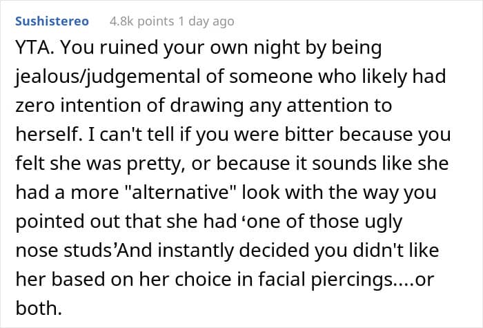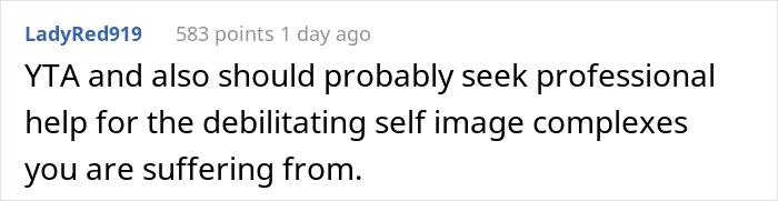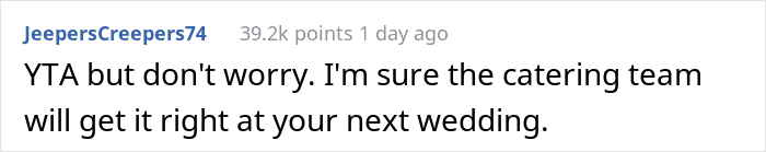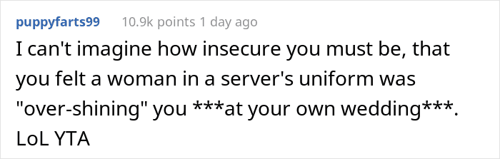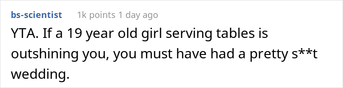 The commenters try to focus the OP’s attention on the fact that this was a server who was just doing her job, and that’s generally the last thing a bride should think about on her wedding day. She obviously needed to dance, laugh, enjoy everything – and not pretend to be the Evil Queen, like “Who is the fairest in all the land?”