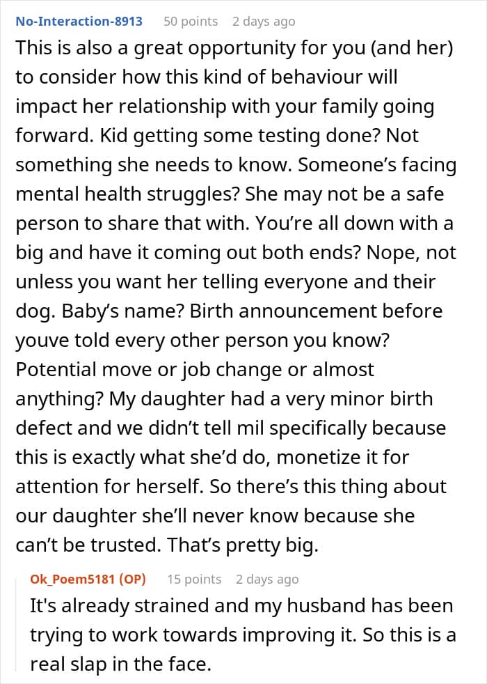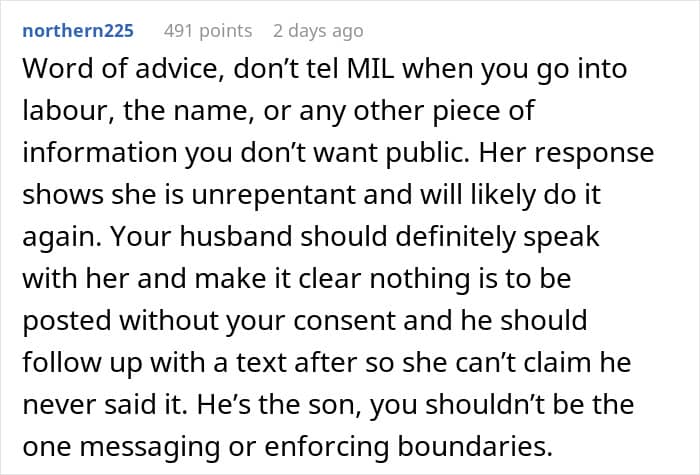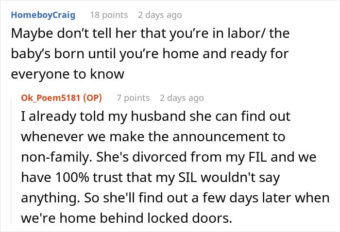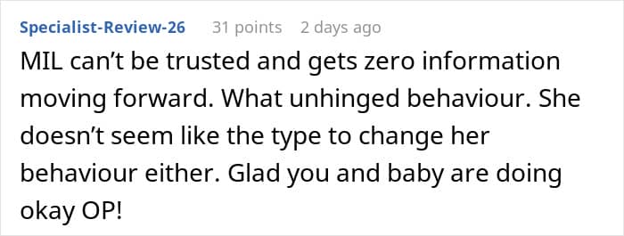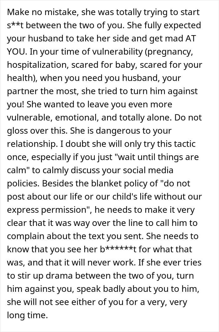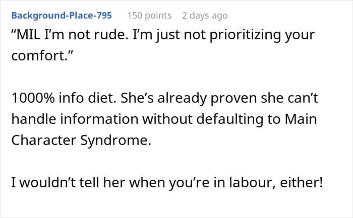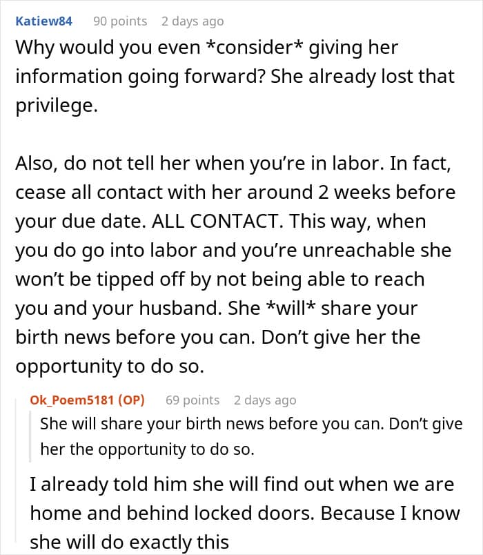 Readers were appalled by the mother-in-law’s behavior, and many warned the author not to tell her when she goes into labor